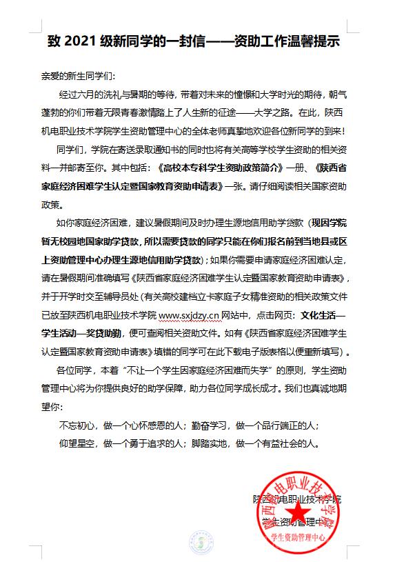 致2021级新同学的一封信——资助工作温馨提示