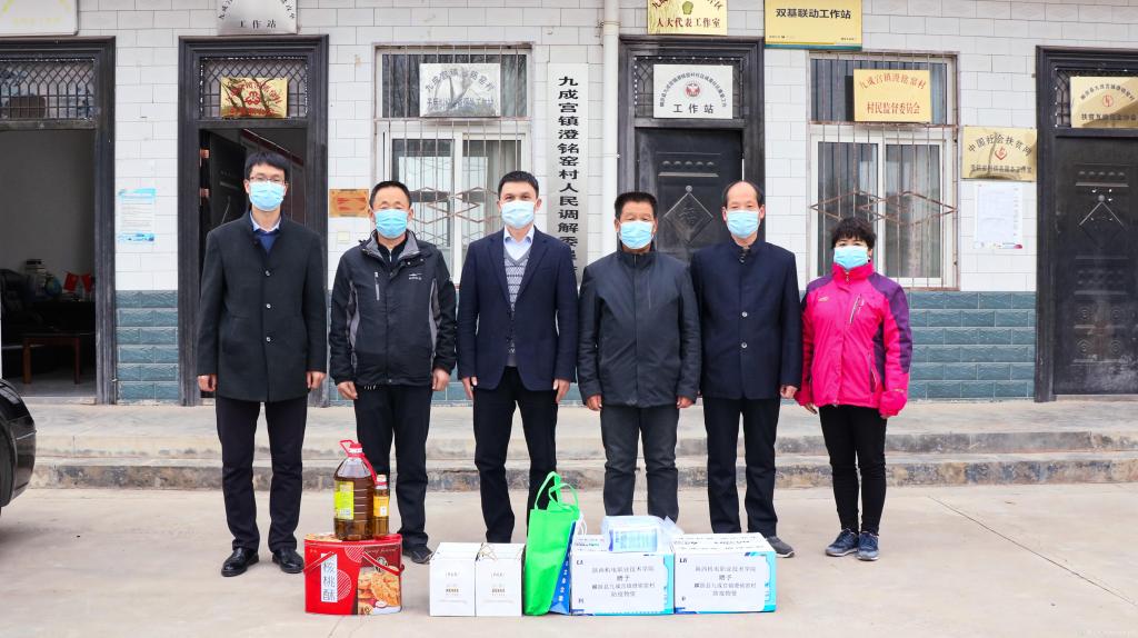 4月1日,党委委员、院长助理赵争东,党委宣传部部长、工会常务副主席李明前往麟游县九成宫镇澄铭窑村,为学院“两联一包”扶贫定点村送去消毒水、医用口罩等防疫物资,看望慰问结对贫困户等困难群众,对接2020年脱贫攻坚工作,看望慰问驻村干部冯祥。