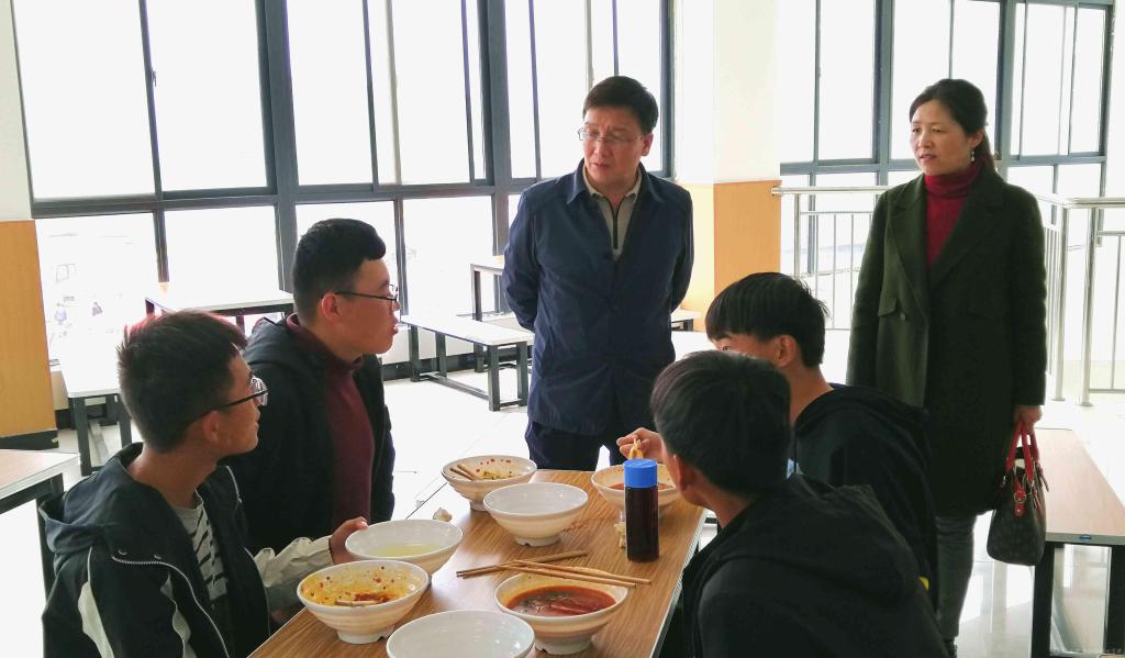 党委书记伊逊智(右二)、党委副书记、院长向纪明(右三)、党委副书记、纪委书记齐晓军(左二)与学生餐厅负责人进行交流