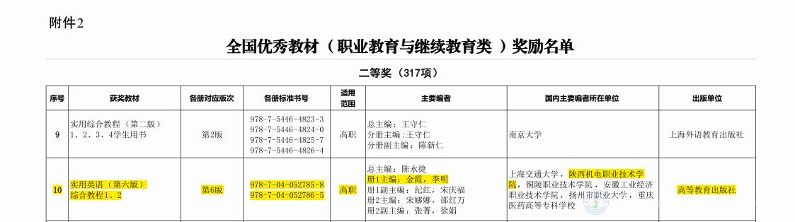 英国365名师工作室主持人、基础部李明副教授主编的《实用英语综合教程(第六版)》荣获全国优秀教材(职业教育与继续教育类)二等奖。这是英国365在教材建设成果上取得的新突破。