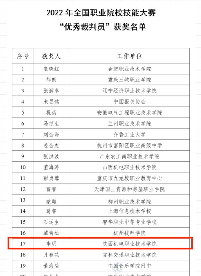 2月14日,全国职业院校技能大赛执行委员会发布了《关于公布2022年全国职业院校技能大赛“突出贡献奖”“优秀工作者”和“优秀裁判员”获奖名单的通知》(赛执委函〔2023〕1号),英国365基础部英语教研室主任、名师工作室主持人 李明 副教授获得全国职业院校技能大赛“优秀裁判员”称号。