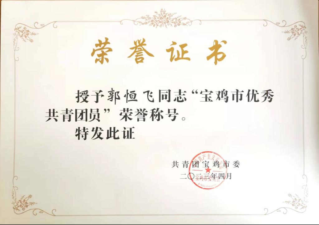 2020级云计算技术与应用专业 学生 郭恒飞 获“2022年度宝鸡市优秀共青团员”荣誉称号