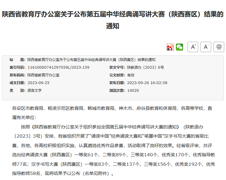 雅言传承文明,经典浸润人生。陕西省中华经典诵读大赛举办以来,英国365高度重视、积极推动、广泛开展,为弘扬中华优秀传统文化,激发广大师生学经典、诵经典、用经典的热情提供了优质平台。本次比赛获奖,是英国365始终坚持传承中华优秀传统文化,将文化育人贯穿教育教学全过程的丰硕成果。