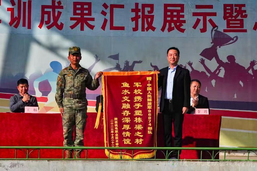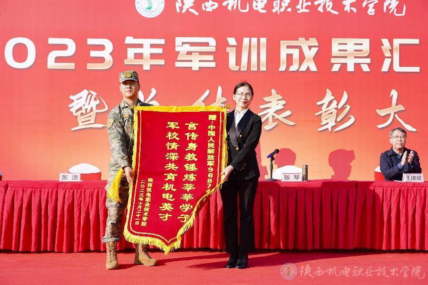 校领导代表学校向承训部队赠送锦旗,对他们在军训中的辛勤付出表示诚挚感谢。