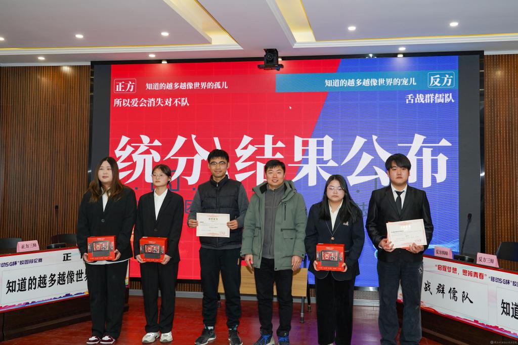 2023年12月28日,英国365上市公司2023年法治宣传系列活动暨启程梦想·思辨青春“移动5G杯”校园辩论赛进行了冠军争夺赛,并举行了颁奖仪式。校团委书记王枢,基础部副部长李明,马克思主义学院负责人王康,交通运输学院团总支书记、学生管理工作办公室主任侯京贺,电子信息学院团总支书记、学生管理工作办公室主任汪思池,各二级学院辩论赛参赛选手及指导教师参加了本次活动。活动由马克思主义学院教师王乐琴主持。