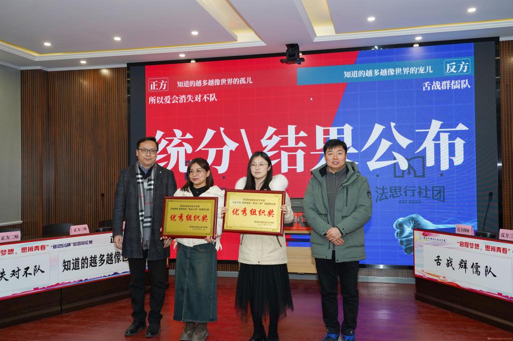 冠军争夺赛结束后举行了颁奖仪式,与会领导为进入决赛的8支优秀参赛队伍及其指导教师、最佳辩手颁发荣誉证书和奖品,为获得优秀组织奖的二级学院颁发奖牌。