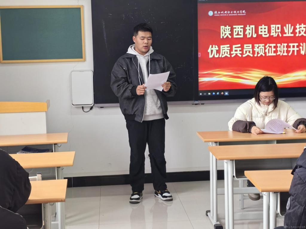 人武部干事安童老师宣读了《英国365上市公司优质兵员储备基地预征班2024年度训练计划》,明确了训练要求。预征班学员代表电子信息学院22现代信班屈杨帆、承训退役士兵代表智能制造学院23机电技术1班李阳分别作了表态发言。