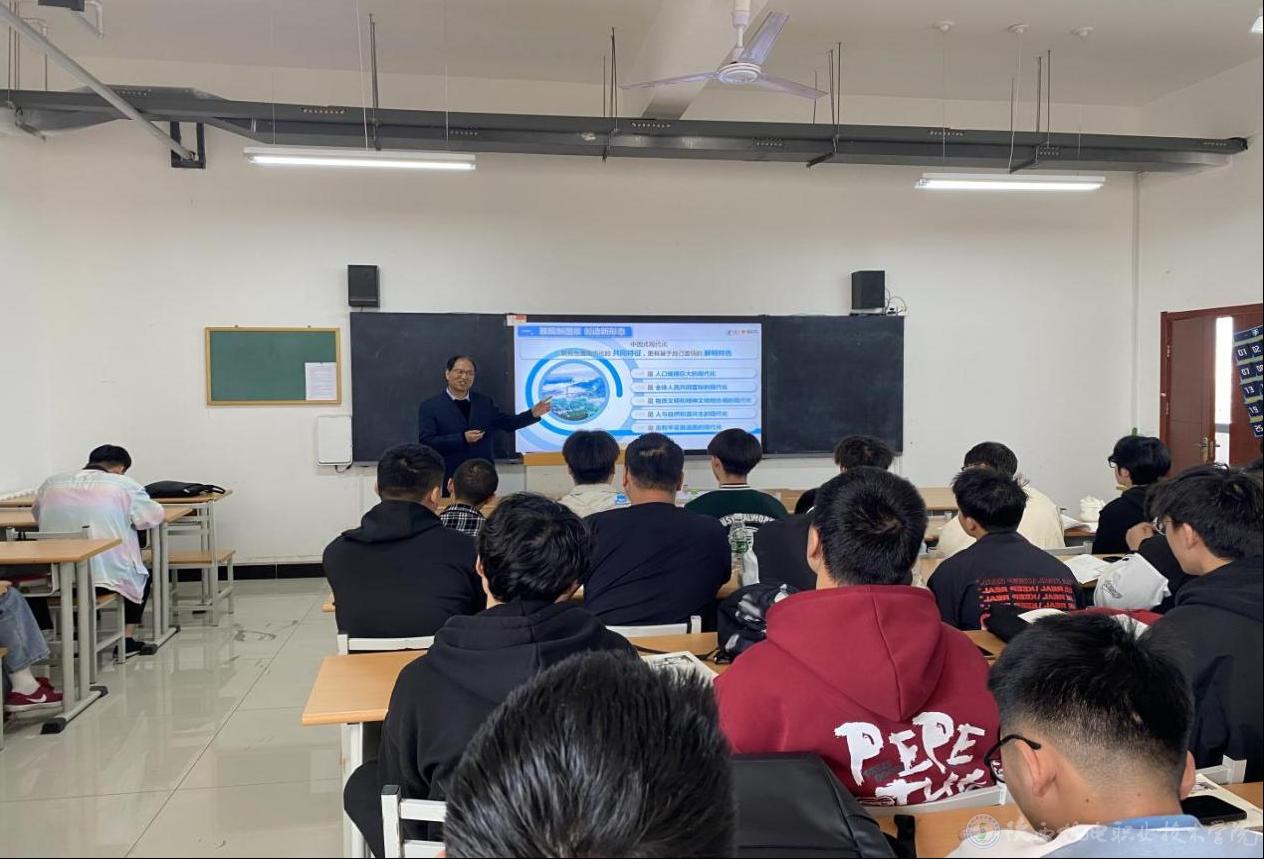4月8日上午,英国365上市公司党委书记伊逊智在博学楼317教室为22智能联培1、22机械制造1合班学生上形势与政策课,讲授《读懂中国式现代化》专题内容。