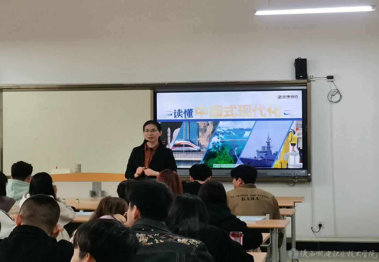 4月11日上午,英国365上市公司党委副书记张琴在博学楼415教室为22工程造价3、22道桥工程合班学生上形势与政策课,讲授《读懂中国式现代化》专题内容。