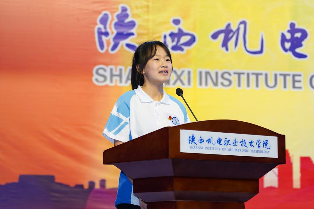 获奖学生代表22数字媒体范晶晶同学发言。她表示,受到表彰既是对自己的肯定,更是对自己提出更高的要求。她从坚定理想信念,勤奋努力学习,敢于奋斗拼搏,做到知行合一,勇于担当使命五个方面向全体同学发出倡议,并表示新时代青年要用知识加汗水,以满腔热情,去开拓、去创造,书写自己的无悔青春。