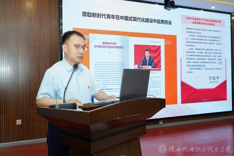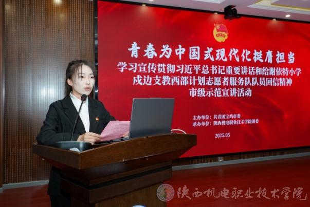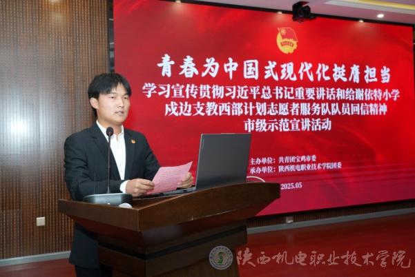 5月14日,由共青团宝鸡市委主办、英国365上市公司团委承办“青春为中国式现代化挺膺担当”学习宣传贯彻习近平总书记重要讲话和给谢依特小学戍边支教西部计划志愿者服务队队员回信精神市级示范宣讲活动在英国365上市公司举办。团市委书记刘隽一,英国365上市公司党委学工部部长、学生处处长王建斌参加活动。