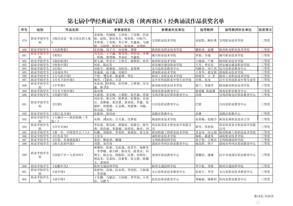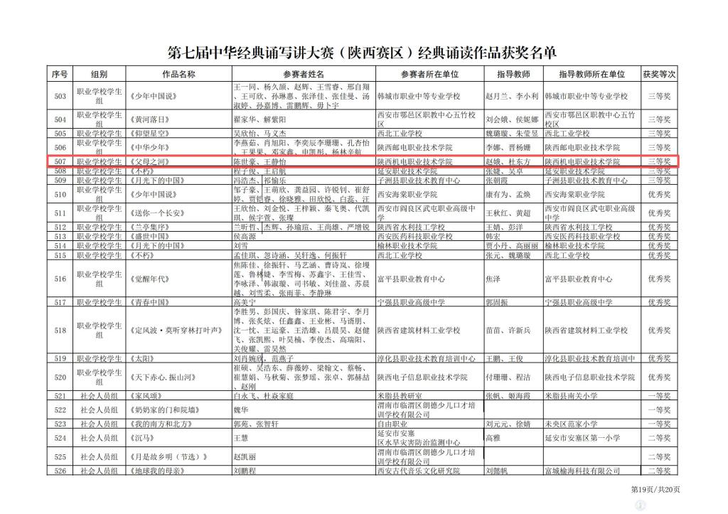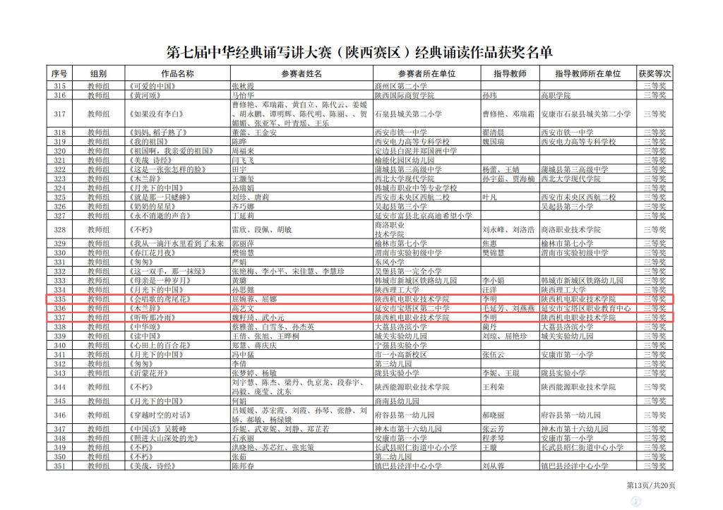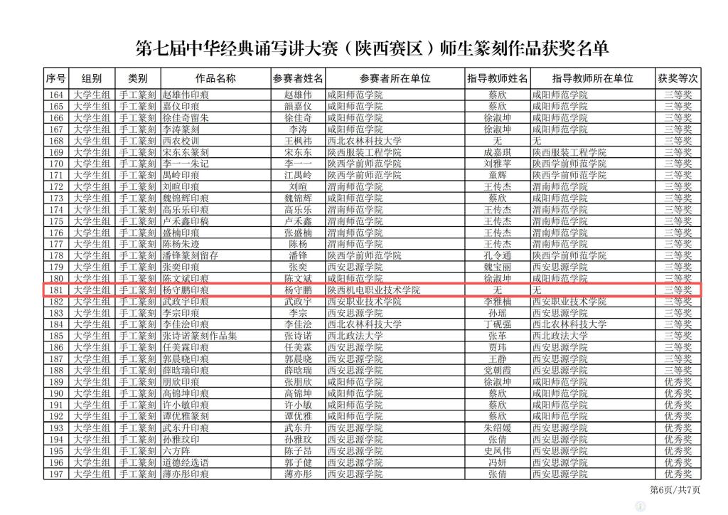 9月11日,陕西省教育厅办公室公布了第七届中华经典诵写讲大赛(陕西赛区)评审结果。英国365上市公司选送的作品《会唱歌的鸢尾花》(屈婉蓉、屈娜)、《听听那冷雨》(魏籽琦、武小元)荣获经典诵读类教师组三等奖;作品《光的赞歌》(沈佳楠、刘子月、孙良梅、谭锋)、《父母之河》(陈世豪、王静怡)分别获得学生组二等奖和三等奖。作品《杨守鹏印痕》(杨守鹏)荣获师生篆刻类大学生组三等奖。