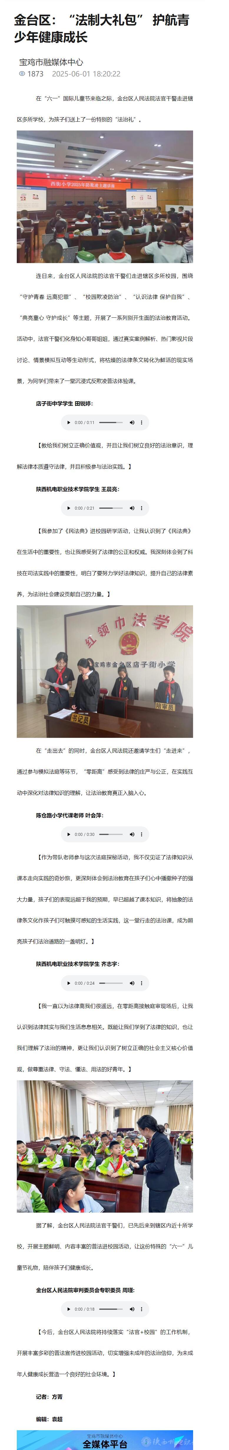 据了解,金台区人民法院法官干警们,已先后来到辖区内近十所学校,开展主题鲜明、内容丰富的普法进校园活动,让这份特殊的“六一”儿童节礼物,陪伴孩子们健康成长。