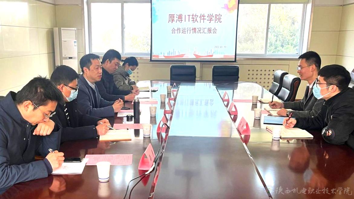 1月19日上午,厚溥IT软件学院合作运行情况汇报会在宝福路校区行政楼3楼西会议室召开。党委委员、副校长张克,电子与信息学院院长姜有奇,电子与信息学院党支部书记高赋、厚溥IT软件学院(以下简称厚溥学院)项目经理周小康等人出席。此次汇报会由姜有奇主持。