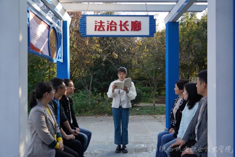 在法治长廊,党委宣传部干事赵珊领学了习近平同志《论教育》一书中《加快构建现代职业教育体系》有关内容;全体党员学习了习近平总书记在庆祝中华人民共和国成立75周年招待会上发表的重要讲话精神并就新中国成立75周年的辉煌成就展开了交流。